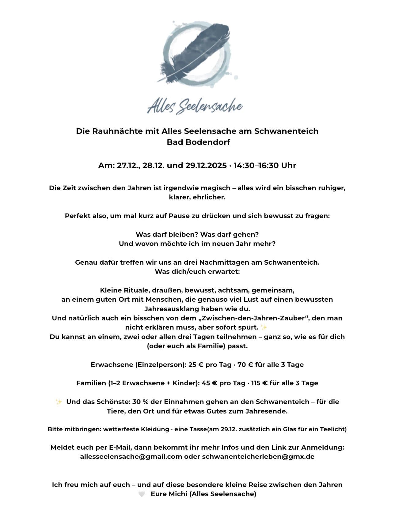 Für Erwachsene und Familien. Anmeldung per E-Mail an schwanenteicherleben@gmx.de.